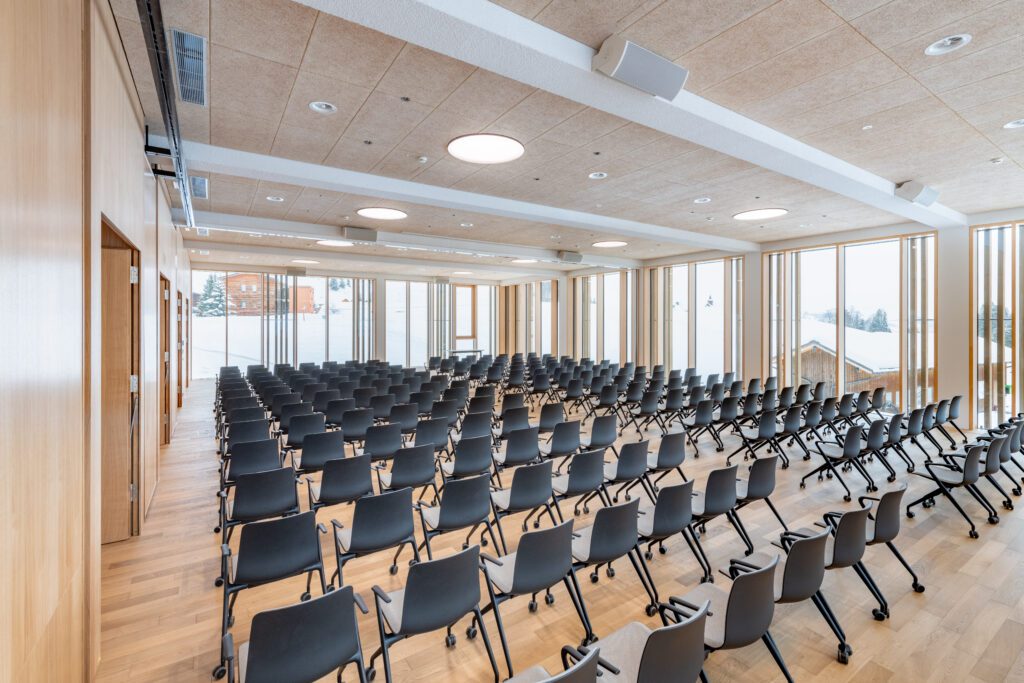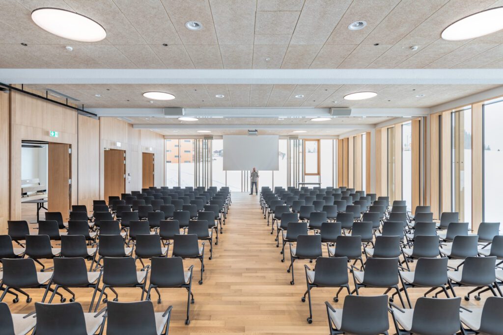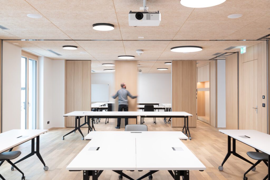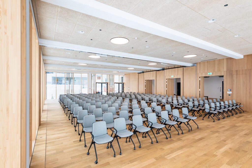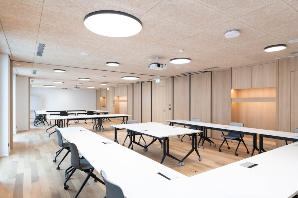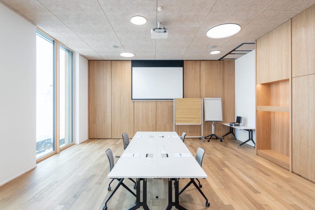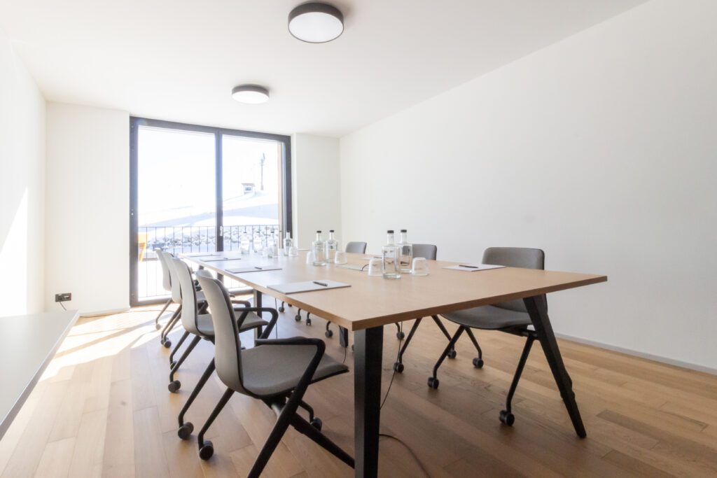 Für Meetings stehen 10 klimatisierte Räume mit viel Tageslicht bereit. Herzstück ist der Panoramasaal (270 m², teilbar) für Plenen und Vorträge bis ca. 250 Personen. Ergänzend: Meetingraum 1–2 (80 m², teilbar) für Workshops sowie Meetingraum 3–5 (139 m², in drei Räume teilbar) für Trainings und Breakouts. Drei Gruppenräume à 25,5 m² runden das Set-up für bis zu 10 Personen ab. Das Foyer eignet sich für Apéros und Kaffeepausen. Moderne Grundtechnik ist verfügbar; zusätzliche Tools lassen sich flexibel zubuchen.