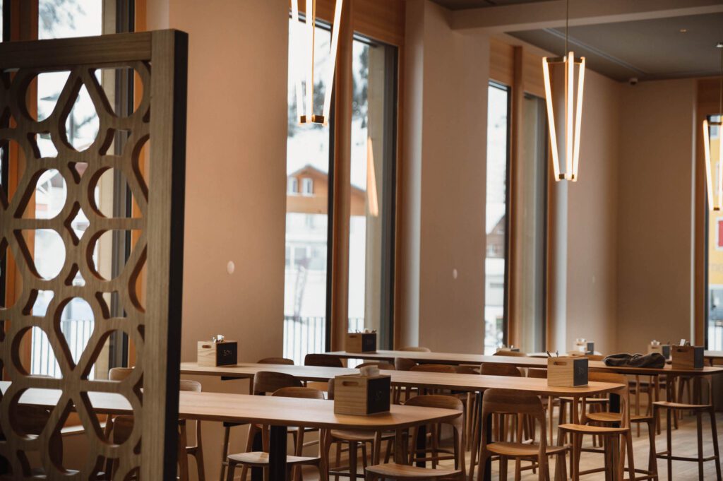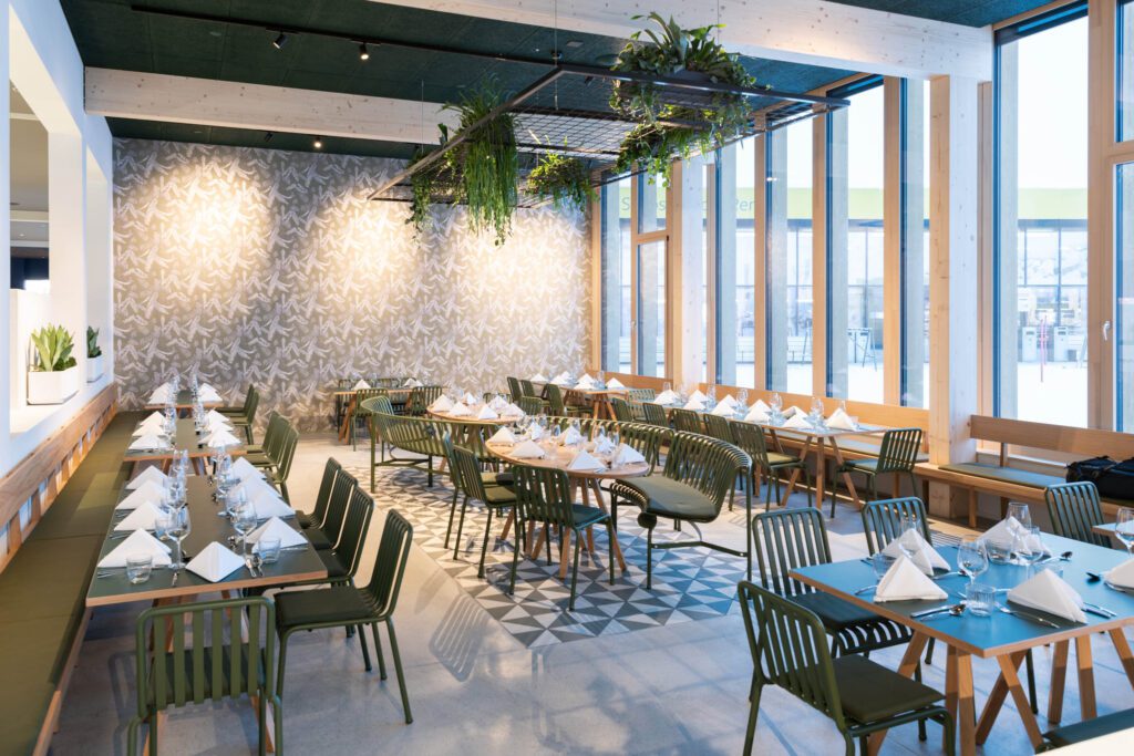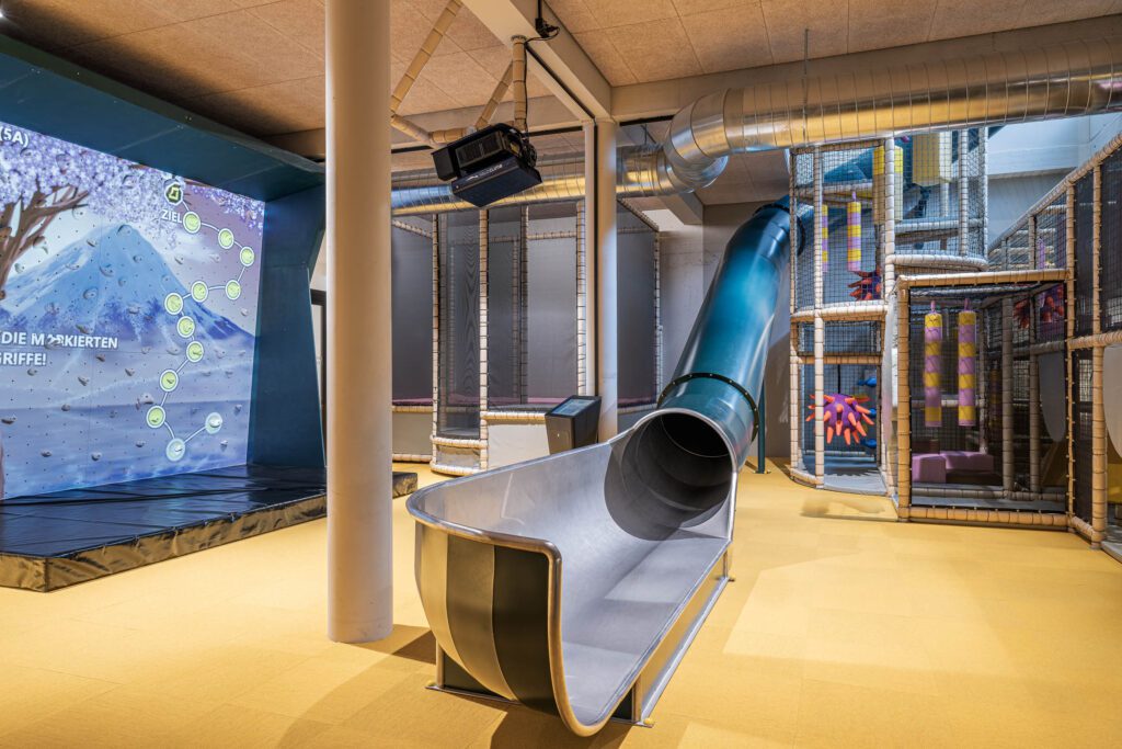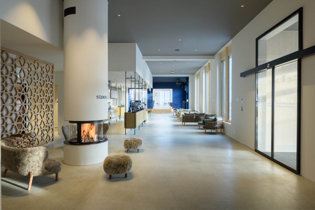 Nach der Arbeit wartet Regeneration mit Aussicht. Unter dem Rooftop sorgen Sauna und Gym für klare Köpfe und frische Energie. Die Bar Blau und die offene Show-Küche liefern unkomplizierten Genuss – vegetarisch, vegan und vom Josper-Grill. Für Teams mit Kindern bietet die Stoos Lodge eine Indoor-Spielzone und eine Berg-Kita im Haus – Meetings und Familie lassen sich so entspannt verbinden.